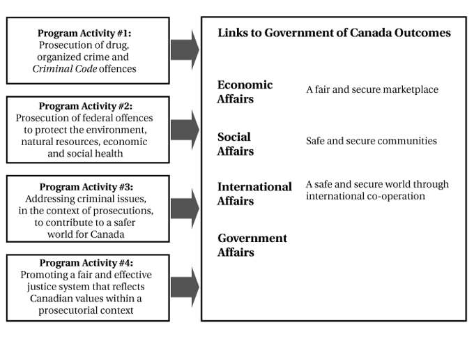 The Government of Canada's performance reporting framework consists of thirteen outcomes grouped under four spending areas: Economic, Social, International and Government Affairs. The figure below illustrates how the PPSC's four program activities are linked to Canada's performance. Table 1 in Section III provides information on the links between the PPSC's planned spending and the Government of Canada outcomes. (For more information on the “Whole of Government Framework